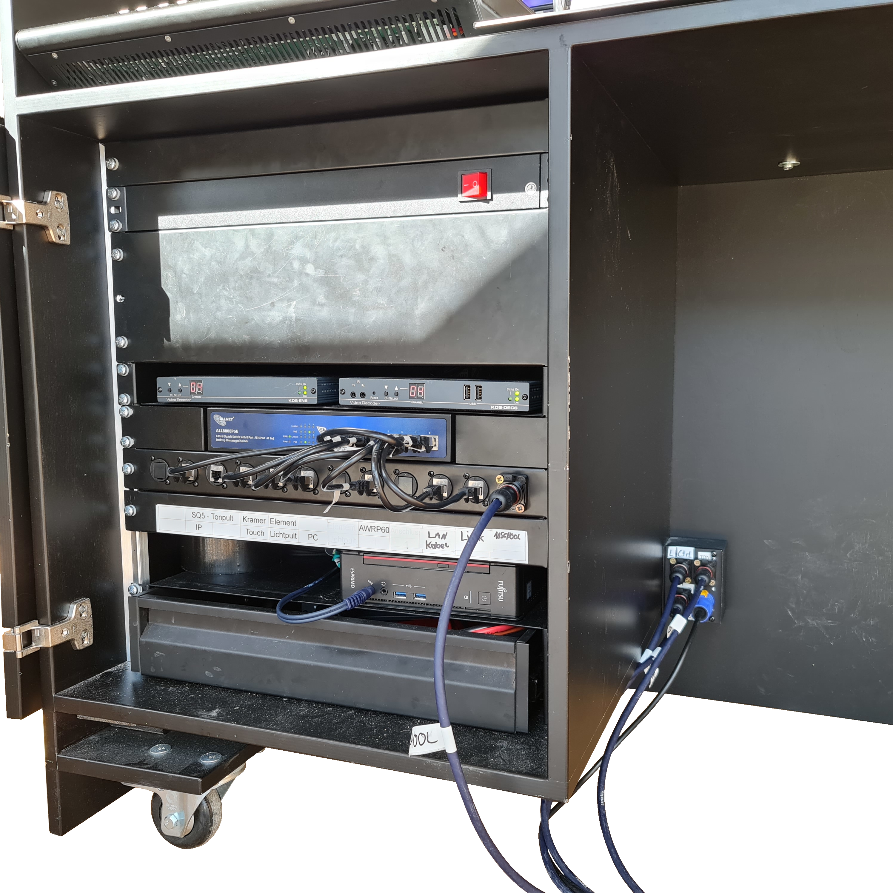 Im Schrank ist ein FUJITSU Desktop ESPRIMO Q556/2 "Cube" verbaut.