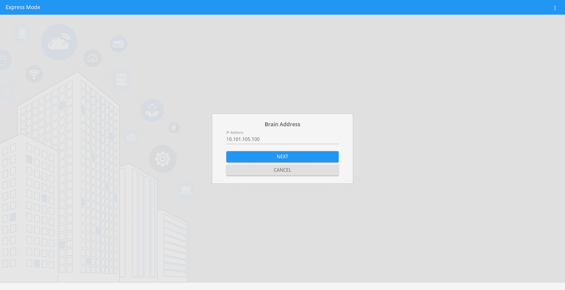 Auf dieser Seite bitte "Express Mode" anwählen und mit der Brain Address 10.101.105.100 verbinden (Die Adresse sollte bereits standardmäßig eingetragen sein).