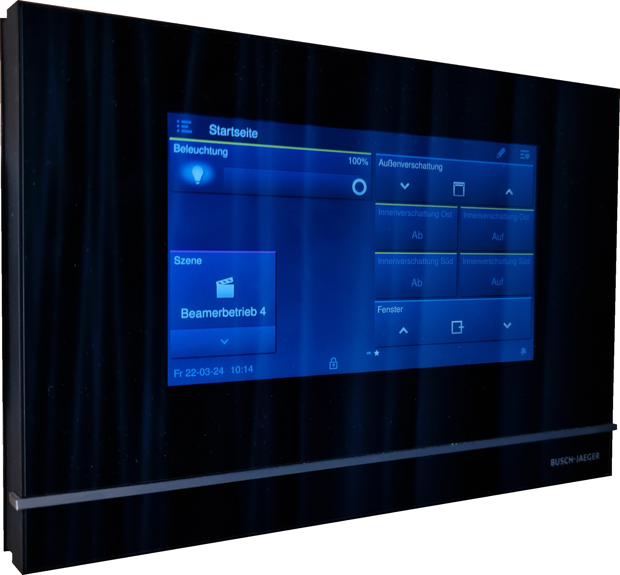Am nördlichen Aula-Eingang ist ein Busch-SmartTouch 7"-Panel installiert, welches zur Steuerung der Innen- und Außenverschattungen, der Fenster sowie der Deckenbeleuchtung dient.
